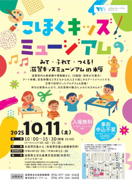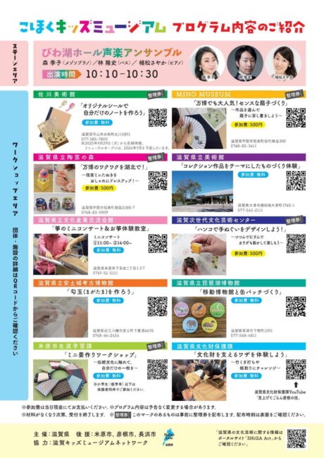 子ども向け体験プログラムを実施する県内美術館等が繋がる「滋賀キッズミュージアムネットワーク」事業の一環として、ネットワーク参加館を中心とする県内美術館等10団体・施設が集まり、各館の個性があふれるワークショップや「びわ湖ホール声楽アンサンブル」のミニステージを楽しむことができるイベントが開催されます。